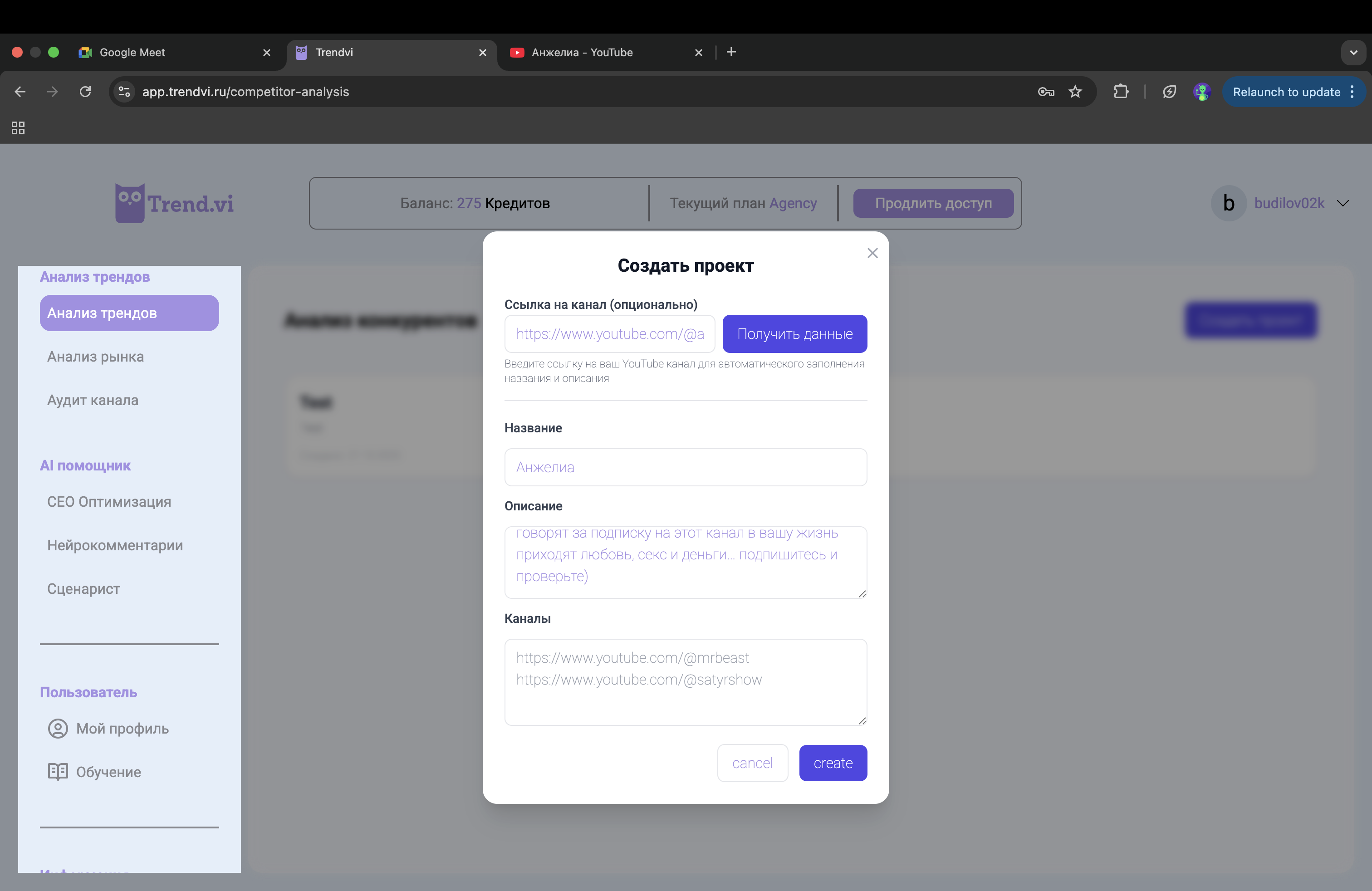 2.1. Исполнитель обязуется предоставлять Пользователю услуги по аналитике трендов видео на платформе YouTube, формированию описаний, тегов, рекомендаций по обложкам, сценариям и другим функциям сервиса Trendvi.