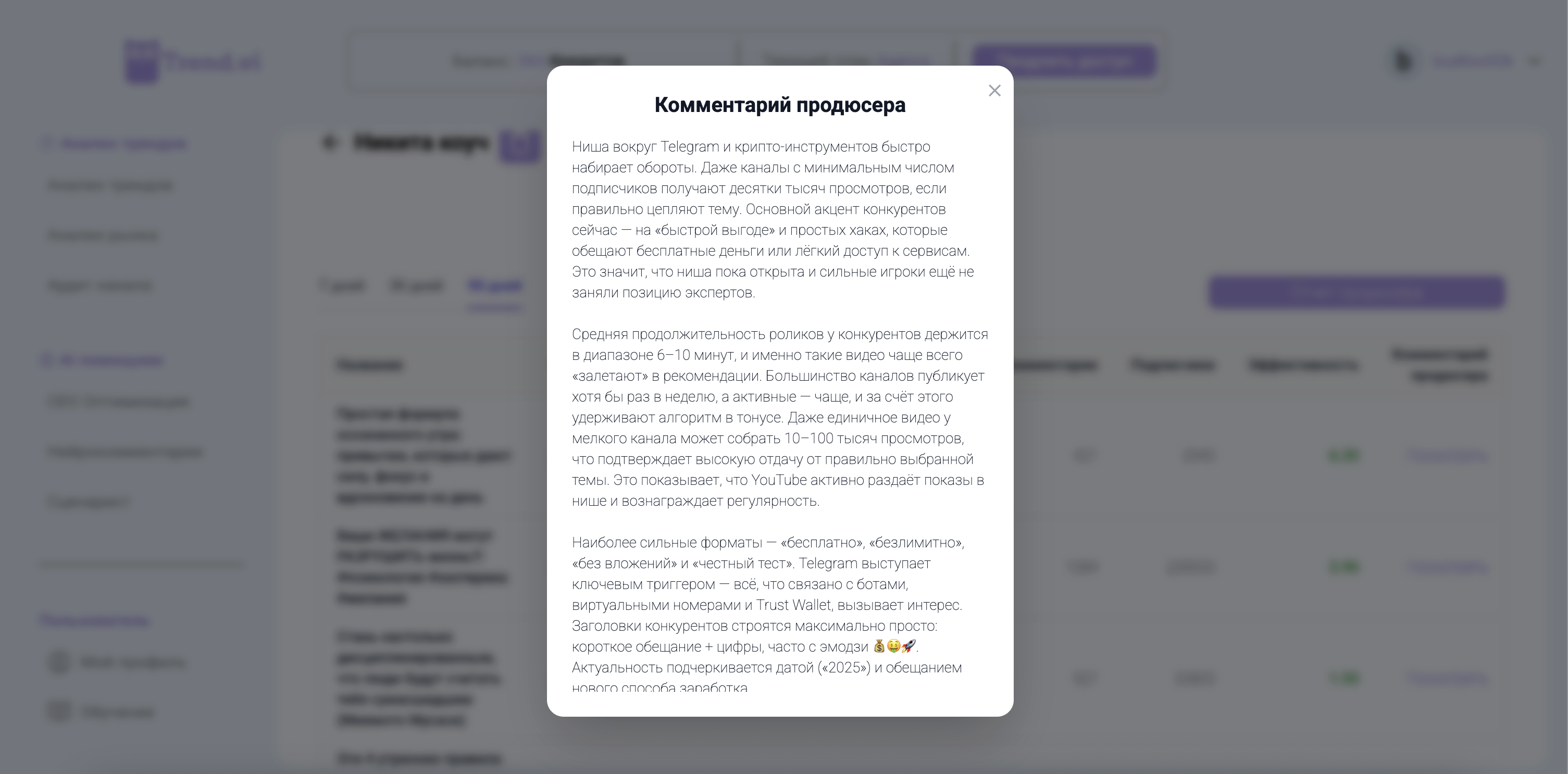 1.1.7. Услуги — комплекс услуг по предоставлению аналитики трендов видео на платформе YouTube, формированию описаний и тегов, рекомендаций по обложкам и сценариям, а также иных функций, представленных или добавляемых в дальнейшем.